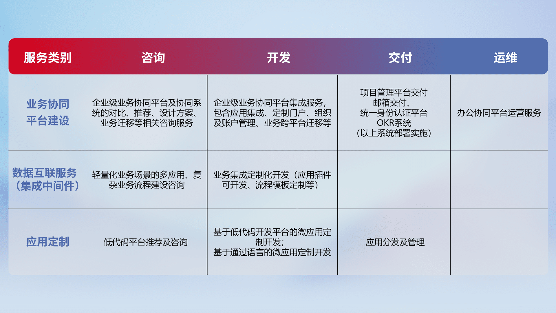 针对钉钉、、、企微、、IDaas等平台级产品提供产品的规划、、方案、、、、交付、、、定制化开发等服务,,实现如统一协同办公、、智能客户服务、、混合会议管理、、、、智能数据查询、、、、等业务场景,,实现数字化转型。。